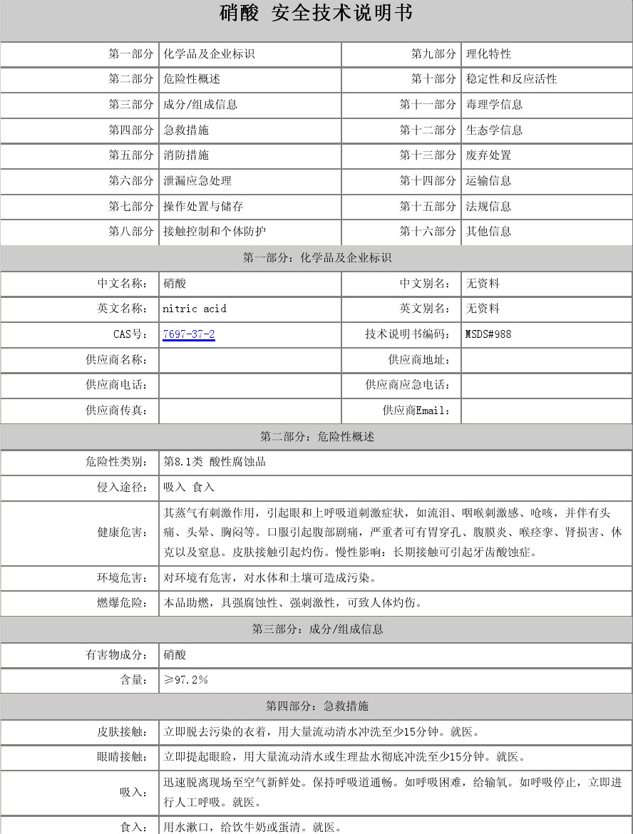 【物理性質(zhì)】純硝酸為無色透明液體,濃硝酸為淡黃色液體(溶有二氧化氮),正常情況下為無色透明液體。有窒息性刺激氣味。濃硝酸含量為68%左右,易揮發(fā),在空氣中產(chǎn)生白霧,是硝酸蒸汽與水蒸汽結(jié)合而形成的硝酸小液滴