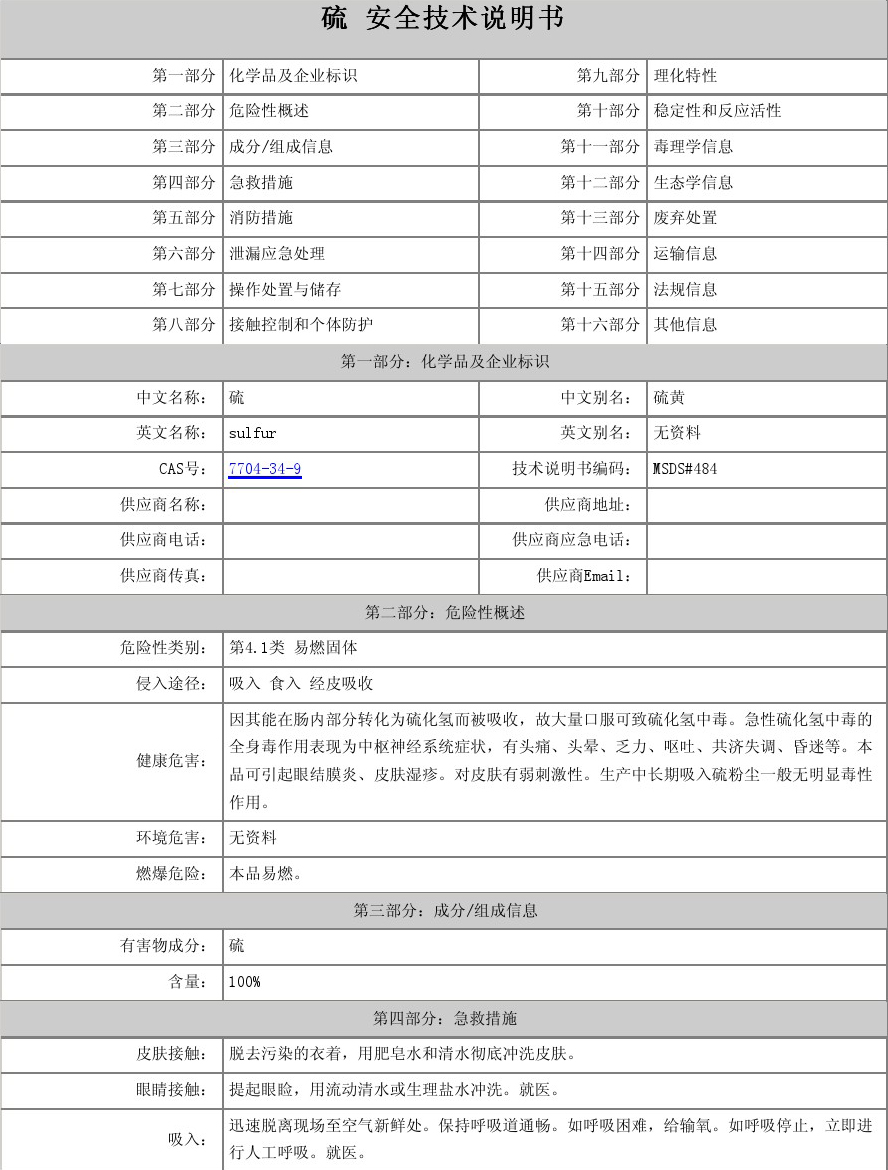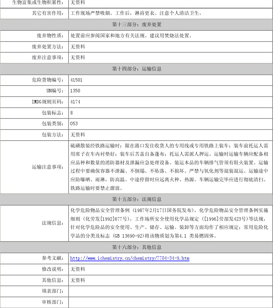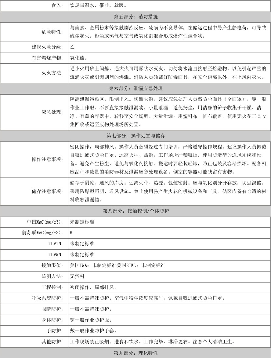 物化性質(zhì):性狀 粉狀硫黃為淡黃色粉末。熔點(diǎn)112.8℃沸點(diǎn)444.6℃相對(duì)密度2.07溶解性 易溶于二硫化碳,不溶于水,略溶于乙醇和醚類。